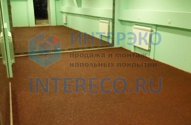 В тренажёрном зале напольное покрытие должно быть особенным, так как там на пол приходятся огромные нагрузки. Как минимум, крепким и износостойким, а ещё – удобным для тренеров и посетителей. Бесспорно, бесшовное покрытие из резиновой крошки – отличный вариант пола для спортзала с тренажёрами. Такое покрытие имеет мягкую пористую структуру, благодаря чему по нему удобно ходить. За счёт высокой прочности оно не портится от падения тяжёлых предметов (штанг, гирь, гантелей). К тому же звукоизоляция полотна сдерживает шум от них. Как только заказчик одобрил идею монтажа резинового пола, специалисты ИнтерЭко взялись за проект.